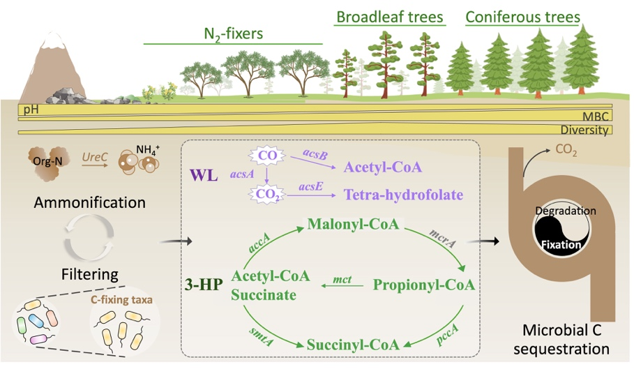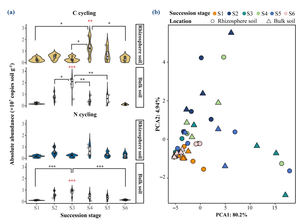 全球气候变暖加速冰川消融,冰川前缘新兴生态系统的发展为增强陆地碳汇开辟了新路径。微生物介导的碳固定和分解过程与氮素转化以及植物-土壤-微生物相互作用紧密耦合,直接调控土壤中碳的积累与归趋。然而,在植被演替过程中,微生物在碳氮循环中的功能潜力如何转变,以及其背后的调控机制仍缺乏系统认识。本研究以青藏高原东部贡嘎山海螺沟冰川前缘约130年的植被演替序列为对象,系统解析根际与非根际土壤中微生物碳氮循环功能基因及群落演替特征,旨在揭示成土早期土壤微生物固碳潜力及其关键调控机制。