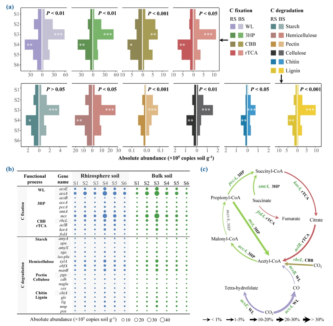 参与碳固定和分解基因的绝对丰度在演替各阶段表现出显著差异,其中在S4阶段的根际土壤和S3阶段的非根际土壤中丰度最高(图2)。