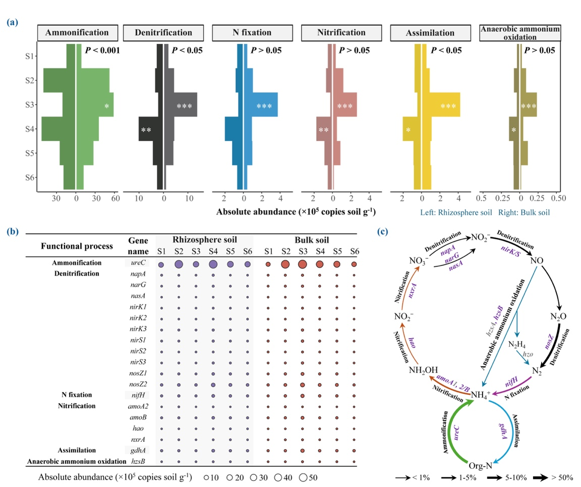 编码固氮、硝化及厌氧氨氧化的基因丰度在整个演替序列中未出现明显变化。相较之下,编码氨化作用、反硝化作用及同化作用的基因丰度在不同演替阶段间表现出显著差异,其中根际土壤在S4阶段达到峰值,非根际土壤在S3阶段达到峰值(图3)。