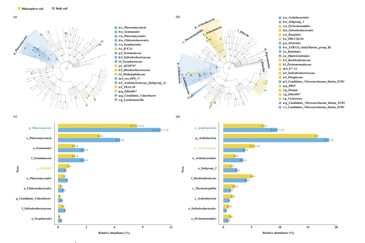 根际土壤中细菌群落主要由变形菌门(Alphaproteobacteria和Rhizobiales)、拟杆菌门(Chitinophagales和Chitinophagaceae)和放线菌门占据优势。在非根际土壤中则观测到更多样的细菌类群,包括酸杆菌门(Acidobacteriia)、浮霉菌门(Planctomycetacia和Gemmatales)和绿弯菌门(图4)。