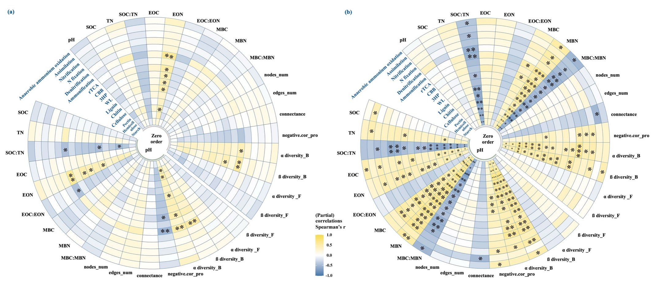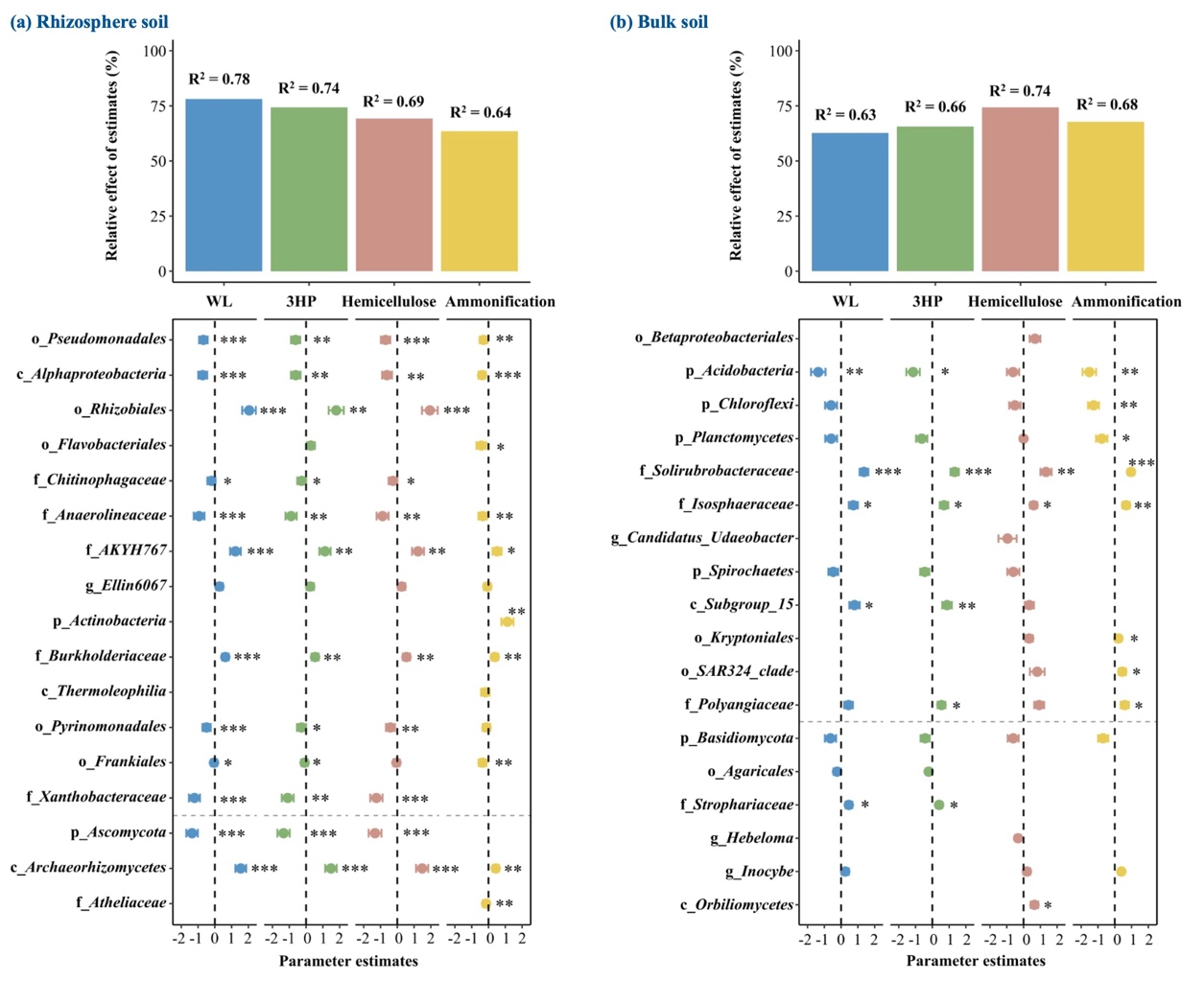 在根际土壤中,EON和微生物多样性与网络复杂性是氨化作用、碳固定(WL与3HP)以及木质素降解过程的主要驱动因子;而在非根际土壤中,SOC:TN和微生物生物量与多样性主要影响碳氮循环功能潜力(图6)。