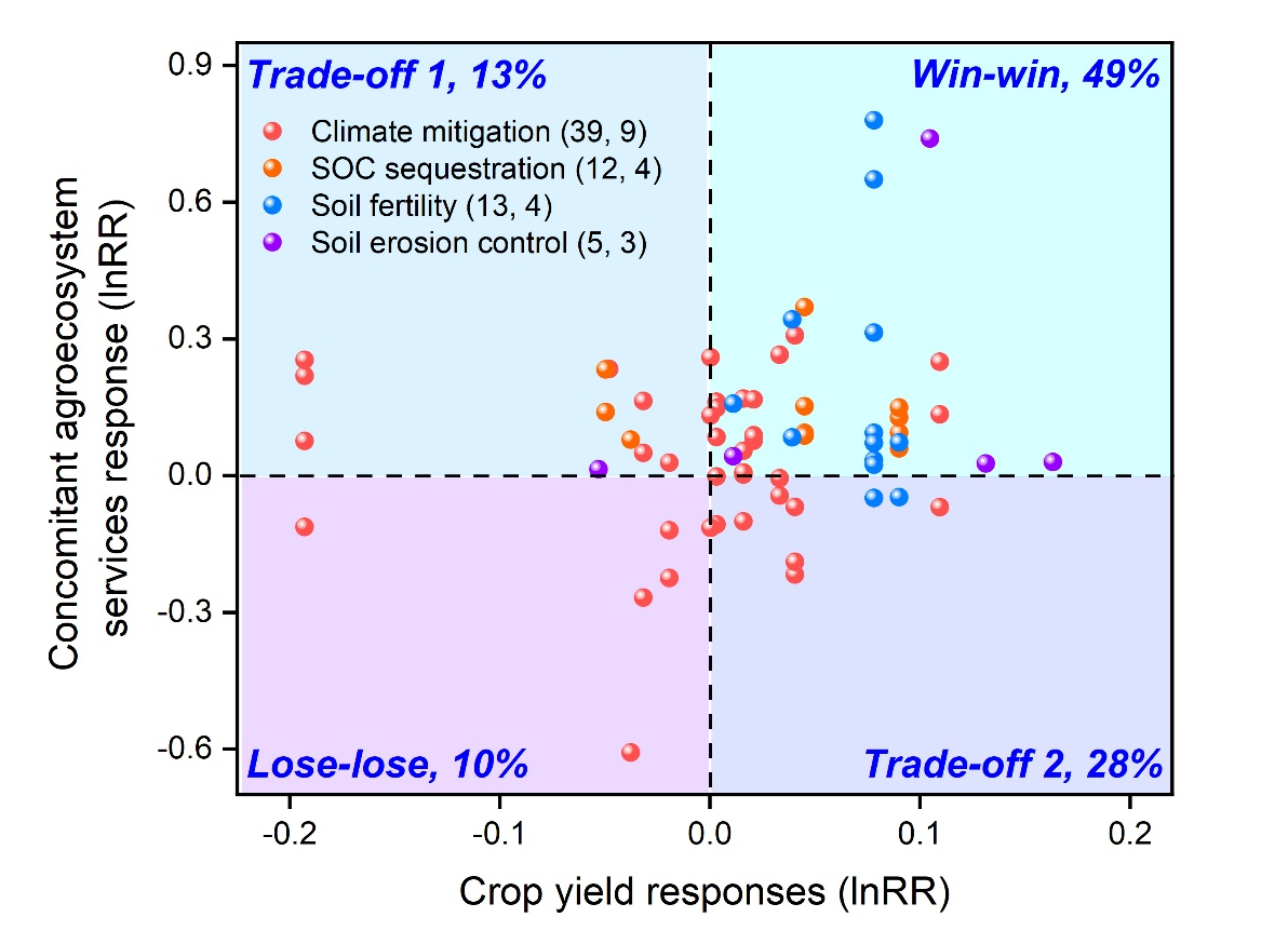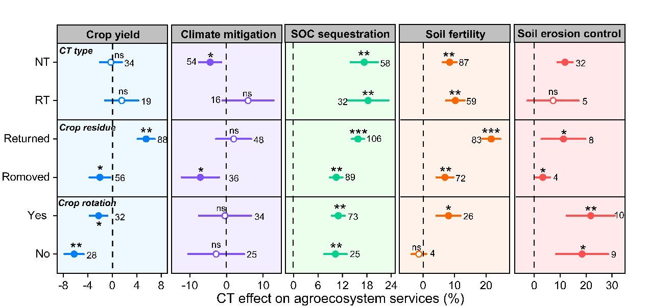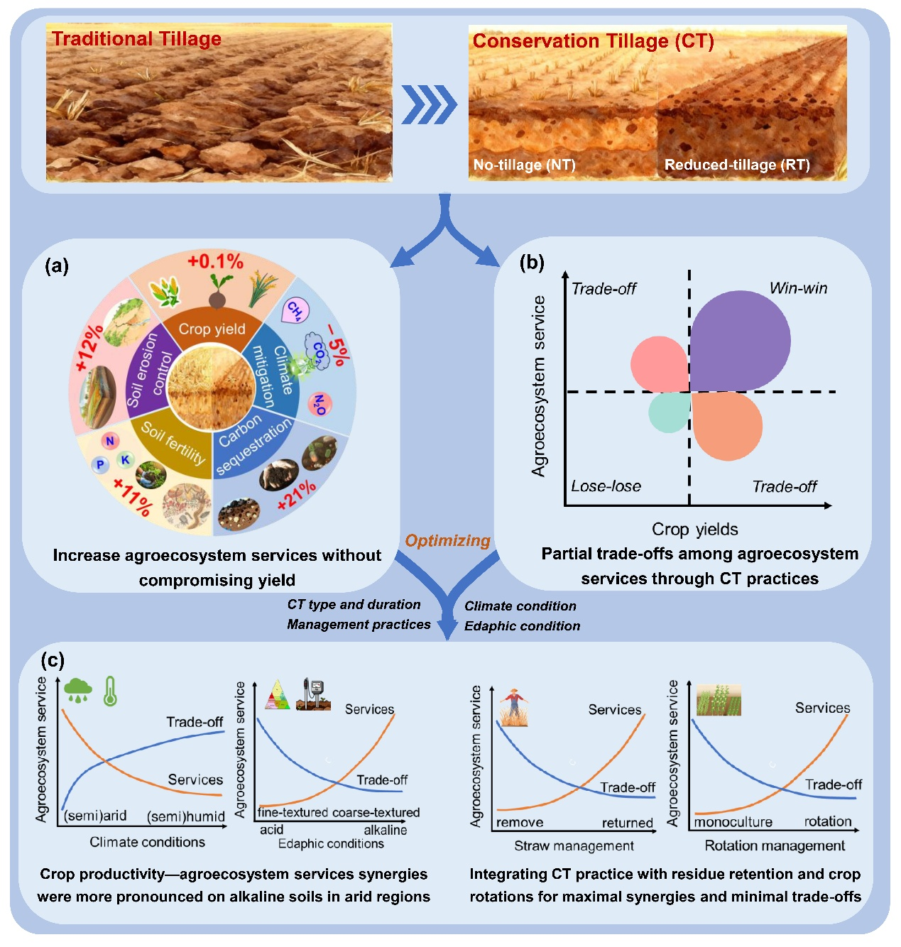 保护性农业(CA)是实现可持续集约化的关键,但其核心措施—保护性耕作(CT)在全球不同环境背景下能否协调作物生产力与生态系统服务之间的权衡关系,仍存在争议。为此,本研究综合了69项已发表的Meta分析研究开展了二阶Meta分析,以提供CT对粮食生产与生态系统服务功能的全球统一评估框架。全球范围内,CT能够显著增强关键的农业生态系统服务,包括温室气体减排、土壤碳固存、土壤肥力提升和侵蚀控制,同时保持作物产量稳定,这为长期以来关于CT综合效益的争议提供了确凿证据。然而,CT也可能导致作物产量与生态系统服务(尤其是作物产量与温室气体减排)之间的部分权衡,且这些权衡关系高度依赖于气候、土壤及管理措施的影响。例如,在半干/干旱区域的碱性土壤中,结合秸秆还田和多样化轮作的保护性耕作能够有效地减少这种权衡取舍,并增强协同效应。总之,我们的综合研究表明,因地制宜地优化保护性耕作实践,对于协调农业生产力与生态系统服务、进而推动全球气候适应型农业系统的发展至关重要。