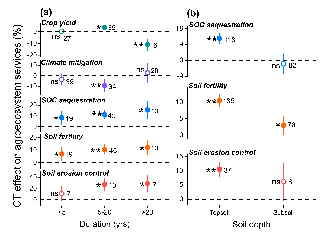 CT对作物产量和生态系统服务的影响取决于其实施持续时间。在最初的5年内,CT对产量和生态系统服务几乎都没有影响。在中期阶段(5-20年),土壤有机碳的逐渐积累促进了土壤结构、肥力和微环境的实质性改善。这些效应进而推动了作物产量的同步增加以及关键生态系统服务的放大。然而,在长时间(>20年)后,作物产量显著下降,而CT对关键功能(如土壤碳固存、肥力维持和侵蚀控制)的积极效应趋于停滞或减弱(图5a)。这一发现强调了管理策略必须具备预见性,需根据不同实施阶段的生态演进规律进行阶段性、针对性的适应性调整。此外,CT对土壤碳固存、肥力和侵蚀控制的积极效应在表层土壤中比在底层土壤中更为显著(图5b)。这表明,CT在调控关键土壤生态系统服务的能力受到垂直梯度的空间限制,凸显了其在改善底层土壤功能方面的内在局限性。