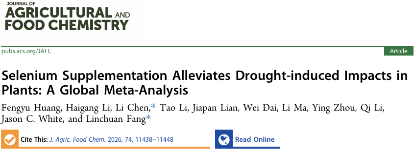 研究证实,硒的作用绝非局限于单一路径,而是通过系统性整合抗氧化防御、养分稳态维持以及水分利用效率提升,全面重塑了植物在极端缺水条件下的生理韧性与生命力。面对未来日益严峻的全球水资源枯竭与极端气候挑战,本项研究不仅为全球干旱农业区的气候适应性管理提供了坚实的量化依据,更为保障人类未来粮食安全、推动绿色可持续农业发展开辟了全新的战略路径。尽管较高浓度的硒在当前数据中展现出最为卓越的促生增益,但在大田应用中仍需警惕潜在的生态与毒害风险。未来亟需结合大尺度田间试验,精准绘制不同作物的安全施用图谱,从而真正将这一微量元素的抗逆潜能,转化为保障农业生产的切实效益。 该研究以"Selenium Supplementation Alleviates Drought-induced Impacts in Plants: A Global Meta-Analysis"为题,作为封面文章发表于国际期刊Journal of Agricultural and Food Chemistry上。该论文第一作者为内蒙古农业大学资源与环境学院黄凤羽教授,通讯作者为武汉理工大学方临川教授。内蒙古农业大学李海港教授、戴伟博士与马丽博士,广西大学连家攀博士,维也纳大学李涛博士以及美国康涅狄格州农业实验站的Jason C. White教授共同参与完成了本项研究。此外,该研究得到了国家自然科学基金(42507032, U21A20237)的资助。