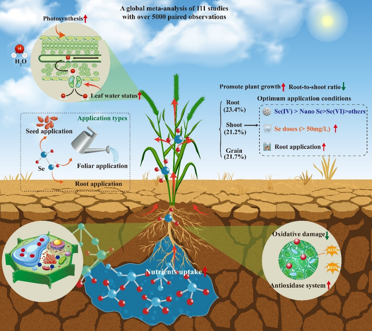 在全球气候变化加剧的背景下,干旱频发已成为限制植物生长和威胁全球粮食安全的核心环境挑战。外源施加微量元素硒(Se)被广泛报道可增强植物的抗逆性,但现有研究多局限于单一物种,缺乏系统性的跨物种量化评估与统一的机制解析。本研究开展了一项包含111项独立研究、涵盖48个不同植物物种的系统发育Meta分析,旨在全面量化外源硒在干旱胁迫下对植物生长、水分吸收及生物量分配的综合影响,并深入阐释其背后的生理生化机制。结果表明,干旱胁迫导致植物地上部、根部和籽粒生物量分别大幅缩减31.9%、28.8%和36.2%,并使根冠比(R/S)显著上升13.8%。在干旱条件下施加外源硒,可使植物的地上部、根部和籽粒生物量分别显著提升21.2%、23.4%和21.7%,并使根冠比显著下降7.9%。施硒效果受到植物类型、硒形态与施用方式及浓度的显著影响。本研究证实硒通过系统性整合抗氧化防御、养分稳态维持以及水分利用效率提升,全面重塑了植物在极端缺水条件下的生理韧性,为全球干旱农业区的气候适应性管理提供了坚实的量化依据(图2)。