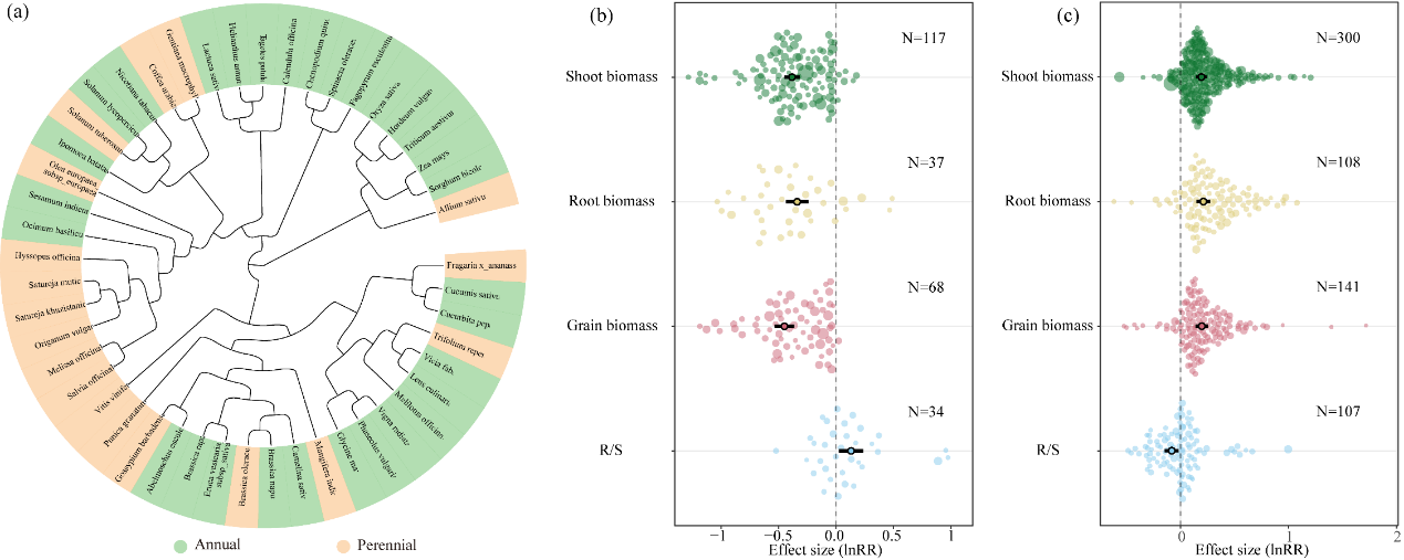 图3 (a) 本研究中分析的48种植物构建的系统发育树,(b) 干旱对地上部生物量、根系生物量、籽粒生物量及根冠比(R/S)的影响,(c) 以及干旱条件下施硒对这些性状的影响