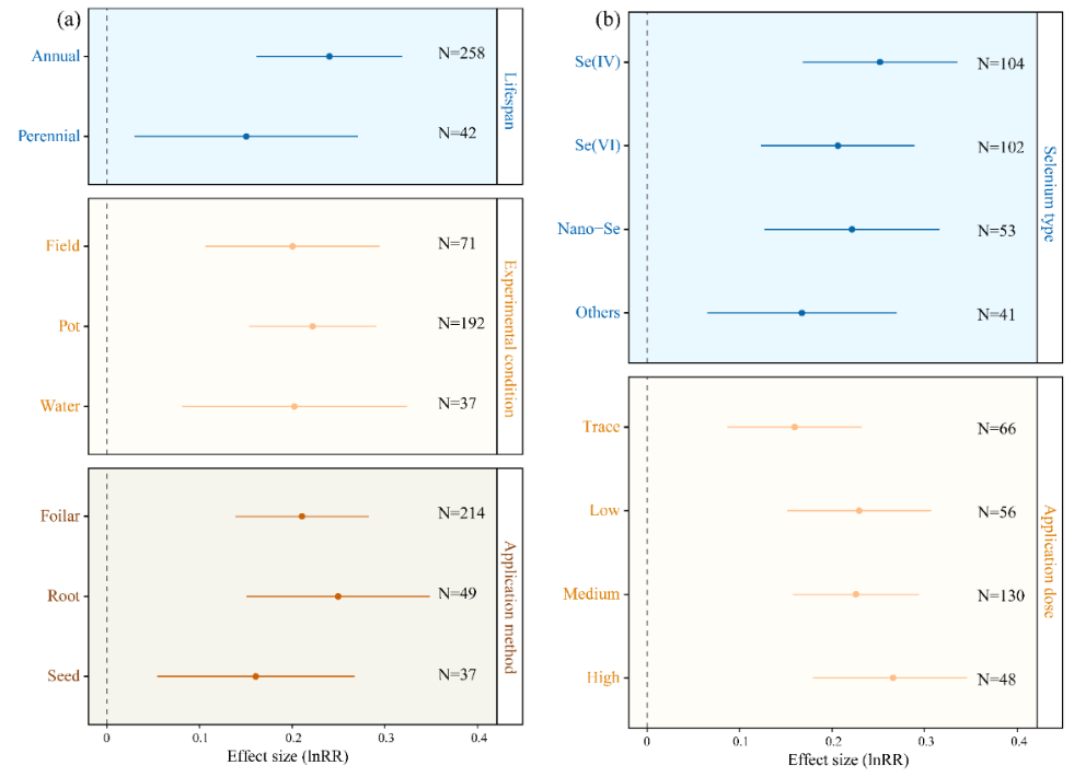 亚组分析揭示了不同实验条件对硒缓解效应的显著影响。在植物类型方面,一年生植物地上部生物量的增幅(27.1%)显著高于多年生植物(16.2%)。在各类硒源中,四价硒(Se(IV))因其高生物利用度表现出最佳促生效果(+28.5%),且根施的提升效果最为显著(+28.3%)。此外,施硒效果呈浓度依赖性,当浓度≥50 mg L⁻¹时,地上部生物量增幅最大(30.3%)(图4)。