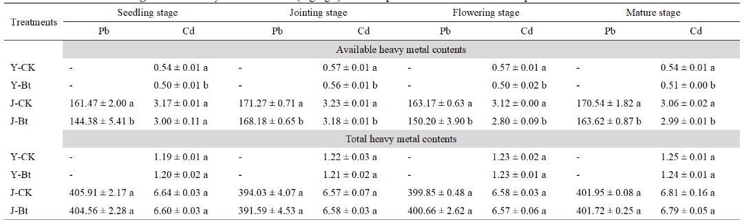 图3 接种苏云金芽孢杆菌对小麦不同生育期根际土壤重金属含量(mg kg-1)的影响