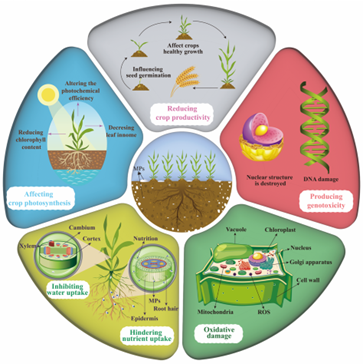 图2. 微塑料对作物生产力的影响:微塑料影响作物的各种生理过程,包括光合作用、水分和养分吸收、氧化应激和基因表达,从而影响作物的整体生产力。注: 微塑料阻碍种子发芽,破坏水分和养分进入作物根系的运输,还会导致细胞内的细胞器损伤。此外,微塑料在作物生长过程中改变基因表达。ROS:活性氧。