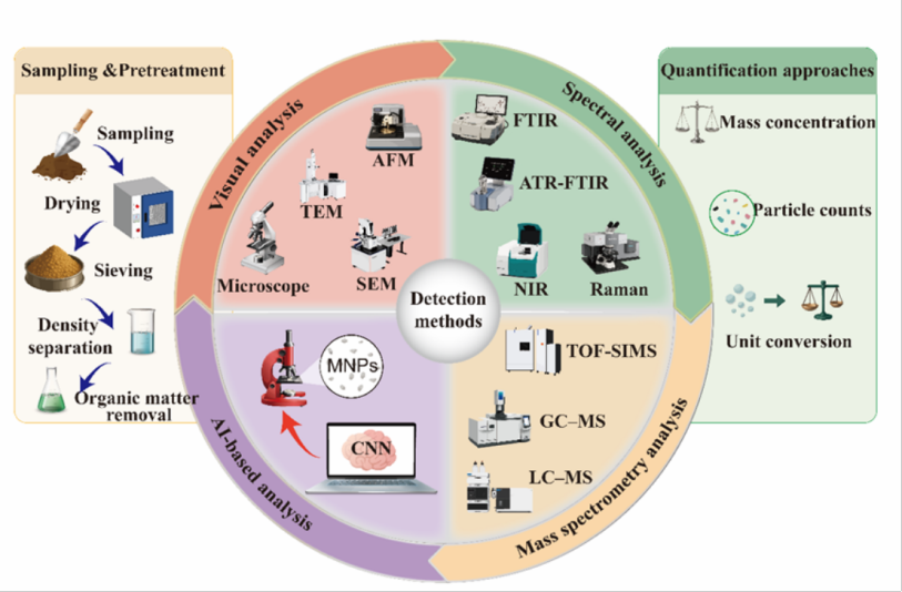 微塑料已被证实是土壤环境中的隐形污染源,它们不仅可能影响陆地生态系统,还对人类健康构成潜在威胁。由于土壤基质复杂、污染形态多样, 如何实现精确、高通量、标准化的检测与量化,一直是科研界亟待攻克的难题。本综述系统整合了土壤微塑料的全流程分析框架,即从采样、预 处理,到检测、定量与数据转换,同时,全面评估显微镜、振动光谱、质谱等技术的优势与不足。更具前沿性的是,文章聚焦于人工智能(AI)在 自动化颗粒识别、光谱解析及数据标准化中的潜力,并提出了“粒子计数-质量数据”转换这一提升跨研究可比性的关键策略。