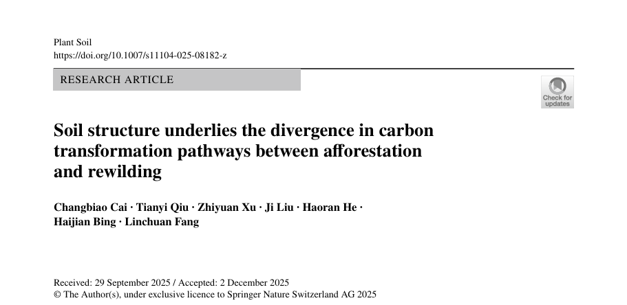 论文题目:Soil structure underlies the divergence in carbon transformation pathways between afforestation and rewilding