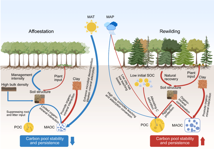 在造林中,高土壤容重(BD)会限制植物根系生长和微生物活动,从而抑制POC和MAOC的形成。而在再野化中,粘土含量高、人为干扰少的土壤更有利于MAOC的稳定积累。