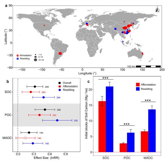 全球气候变化背景下,森林作为最大的陆地碳汇,其恢复与保护对实现碳中和目标至关重要。目前,造林(Afforestation)与再野化(Rewilding)是两种主流 的森林恢复策略。然而,二者对土壤有机碳积累与稳定的影响机制尚不明确,尤其是在土壤结构如何调控碳转化途径方面缺乏系统研究。厘清这两种恢复方式的差 异,对于科学指导全球森林碳汇管理、提升气候减缓潜力具有重要意义。因此我们收集了全球36项研究进行meta分析,以识别不同森林恢复方式下土壤碳组分的 关键驱动因素和稳定途径(图1)。