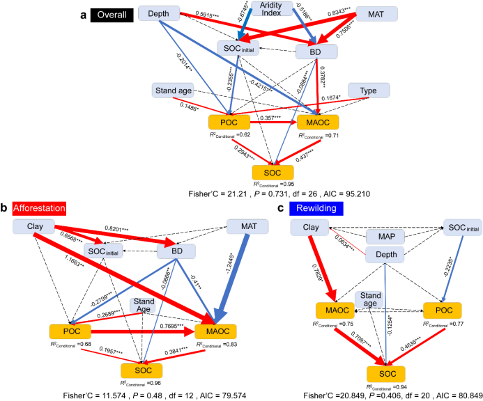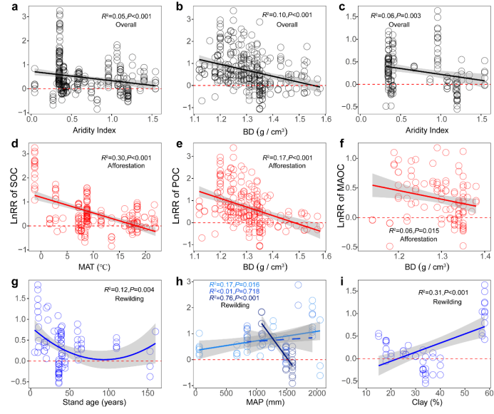 干旱指数、初始碳储量、降水量等环境因子对两种恢复方式的碳积累路径具有显著调节作用。在粘土含量高的地区,再野化能更好地促进MAOC稳定;而在低密度土壤中,造林可有效提升POC积累。