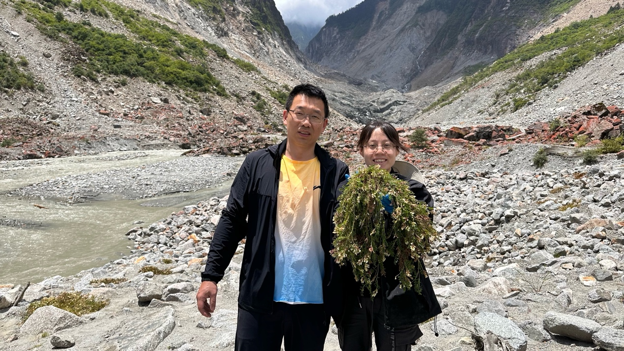 王雨涵(右一)与导师方临川研究员(左一)在海螺沟冰川前缘进行样品采集