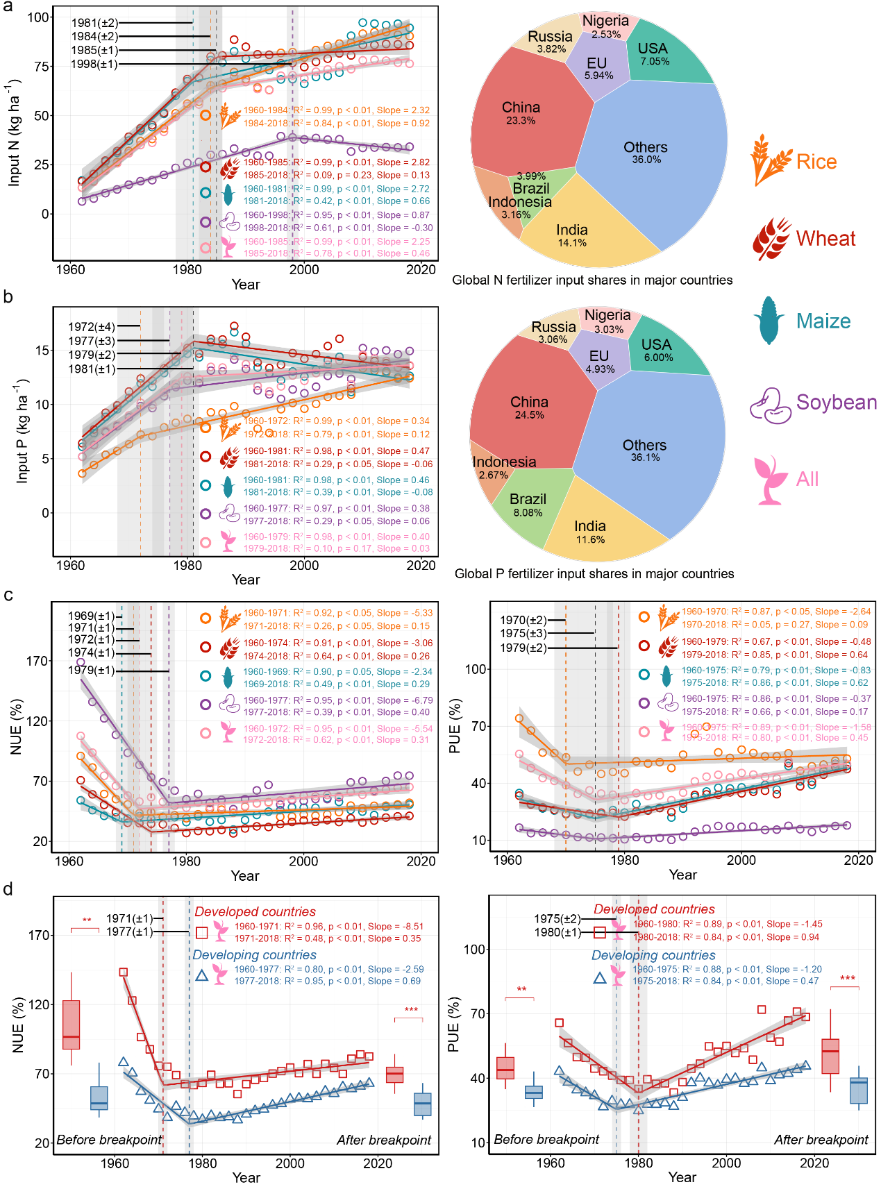 图2 全球氮和磷化肥投入及养分利用效率的时间变化模式