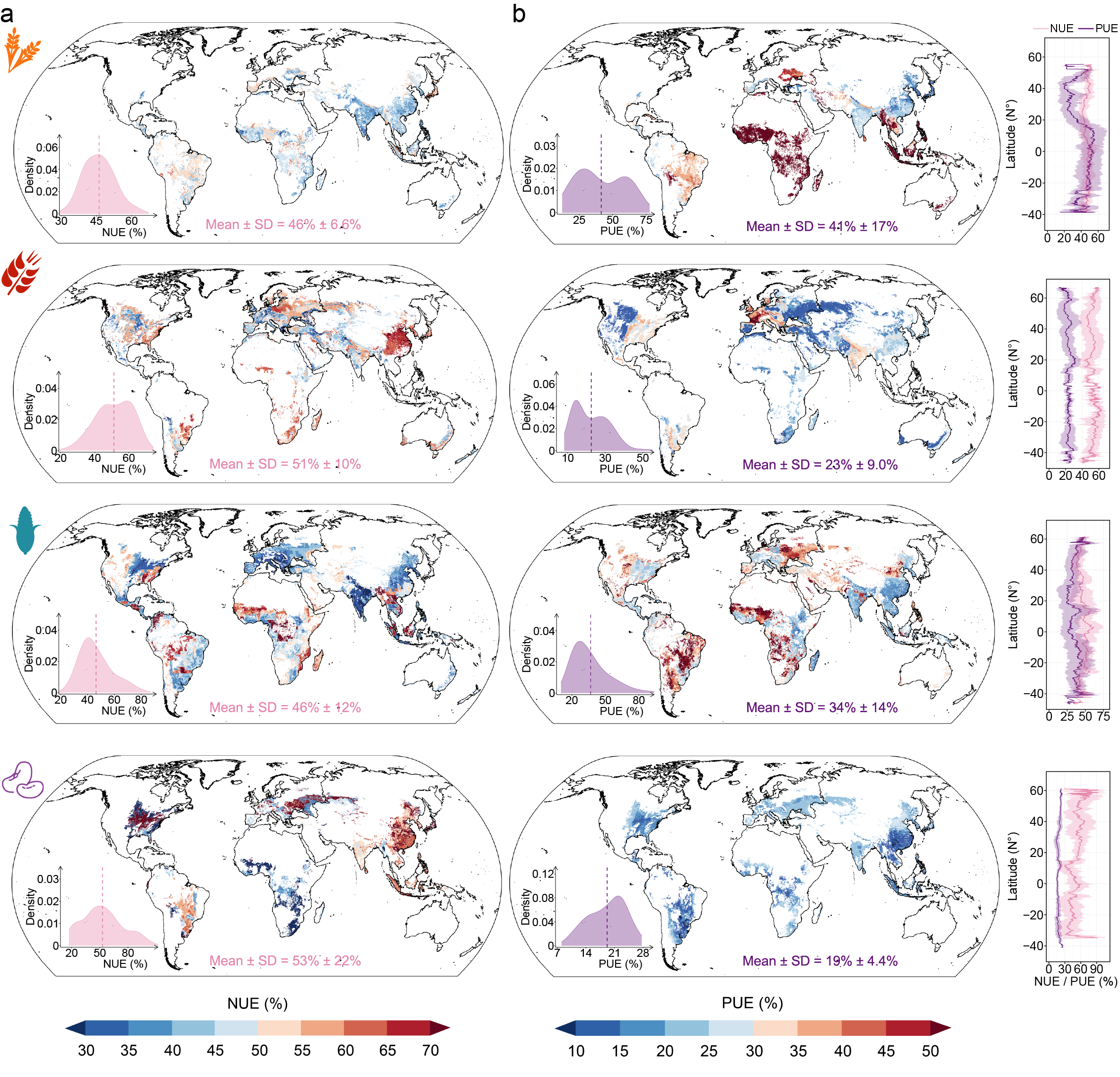 图3 四种主要作物(稻、麦、玉米和大豆)氮和磷养分利用效率的全球空间格局