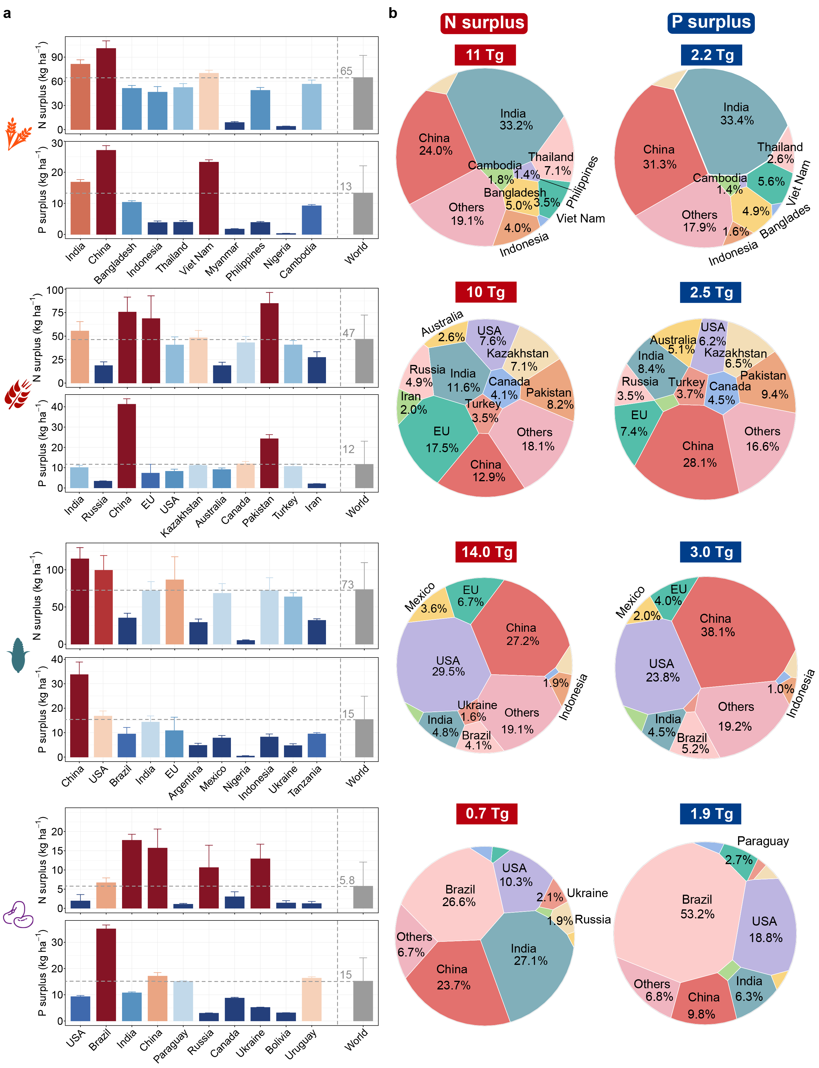 图4 四种主要作物(稻、麦、玉米和大豆)全球氮和磷化肥盈余强度及负荷