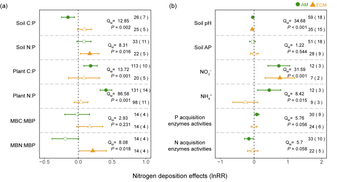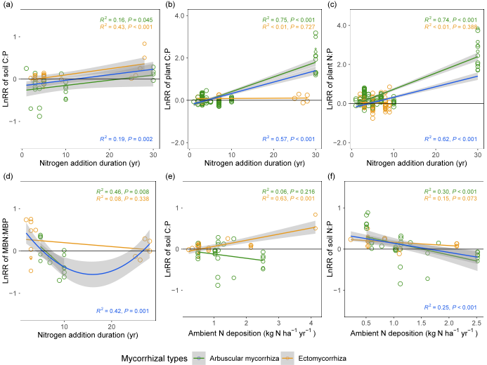 综上,本研究不仅证实了氮沉降加剧生态系统磷限制的普遍趋势,更强调了菌根策略在调节这一限制过程中的关键作用,忽视其作用可能导致对氮沉降所诱导的磷限制程度的高估。因此,我们可以利用植物-微生物相互作用机制来缓解气候变化所带来的日益严峻的影响。