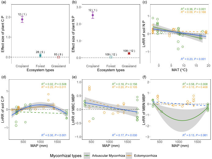 菌根类型在其中发挥了关键的调控作用:外生菌根(ECM)系统更有利于缓解宿主植物的磷限制,而丛枝菌根(AM)系统则对土壤微生物的磷获取具有更强支持作用。这种功能分化可能与两类菌根在养分获取策略、菌丝形态及宿主互作方式上的差异有关。