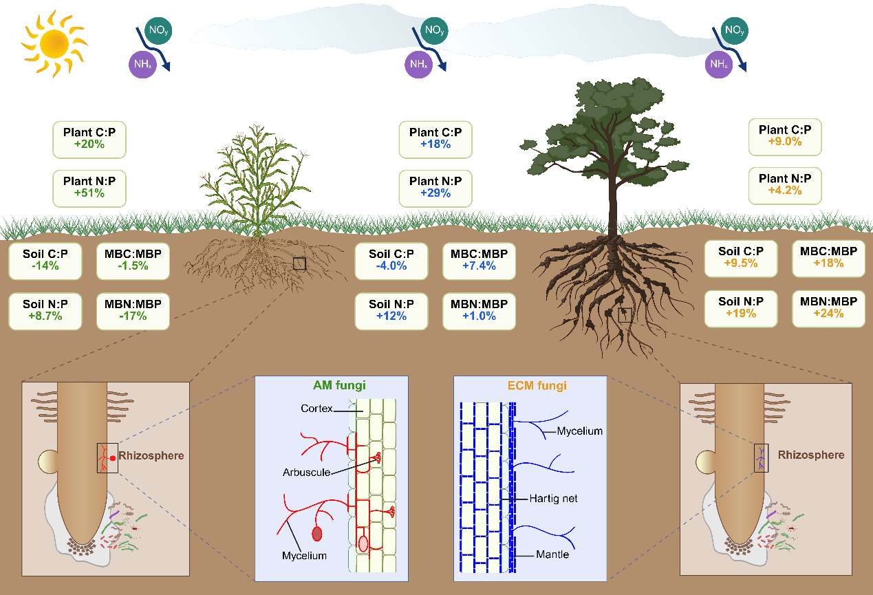 人类活动导致的大气氮沉降持续增加,已成为改变陆地生态系统养分循环的重要驱动因素。氮的富集在提升土壤碳储量的同时,也加剧了氮磷化学计量失衡,可能引发广泛的磷限制问 题。然而,自然系统中广泛存在的植物-真菌共生关系——菌根,是否以及如何调节这一过程,尚缺乏系统认识。为此,本研究通过整合全球观测数据,系统揭示了菌根类型在调控氮沉 降诱导的磷限制中的关键作用。