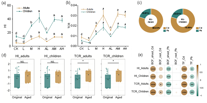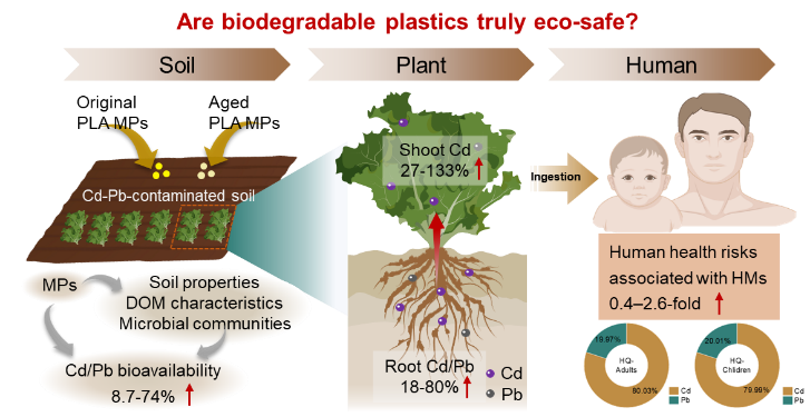 随着生物可降解塑料(例如,聚乳酸PLA)的广泛应用,其在环境中的潜在影响日益引发关注,尤其是在与重金属复合污染的农田土壤中。然而,PLA微塑料(MPs)如何调控重金属环境行为的机制仍缺乏系统认识。本研究通过开展盆栽试验,探究PLA MPs在土壤-生菜体系中对镉(Cd)和铅(Pb)迁移转化、生菜吸收及相关人体健康风险的影响。结果表明,PLA MPs通过改变土壤性质、溶解性有机质组成及微生物群落结构,显著提高了Cd(13.0%-73.8%)和Pb(8.7%-60.9%)的生物有效性。相应地,PLA MPs促进了生菜体内Cd的富集与转运,导致植株光合作用受抑及氧化损伤。中、高水平PLA MPs显著增加了重金属相关的非致癌风险(0.4-1.9倍)和致癌风险(0.8-2.6倍),其中地上部Cd累积是健康风险增加的主要贡献因子。本研究强调了生物可降解微塑料的潜在生态与健康风险,呼吁对其被普遍认定的环境可持续性进行重新审视。