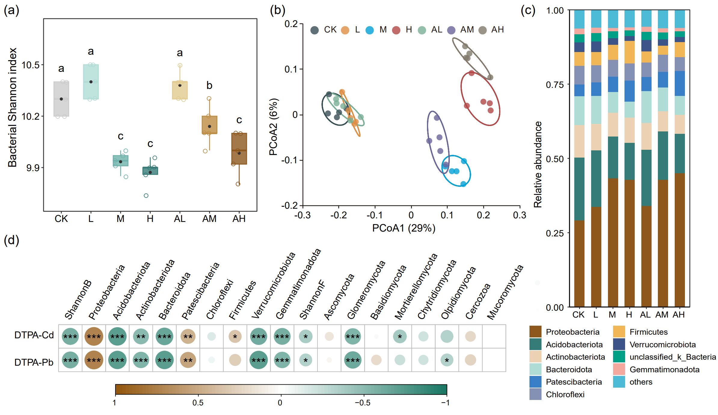 PLA改变了土壤微生物群落结构,其中细菌对PLA的响应比真菌更为敏感。中、高浓度PLA处理显著降低了细菌的Shannon指数。对于真菌,仅在老化、高浓度处理组中观察到Shannon指数显著下降。PCoA分析表明,不同处理的样品点在细菌和真菌水平上均实现了显著分离(p = 0.001)。在相对丰度方面,优势细菌门为Proteobacteria和Acidobacteriota;优势真菌门为Ascomycota和Glomeromycota。与对照相比,PLA MPs处理显著提高了Proteobacteria的相对丰度,且随浓度升高而增加,而Acidobacteriota和Actinobacteriota则呈相反趋势。Bacteroidota、Verrucomicrobiota和Gemmatimonadota在低MPs浓度下变化不显著,但在中、高浓度处理下显著下降(图1)。