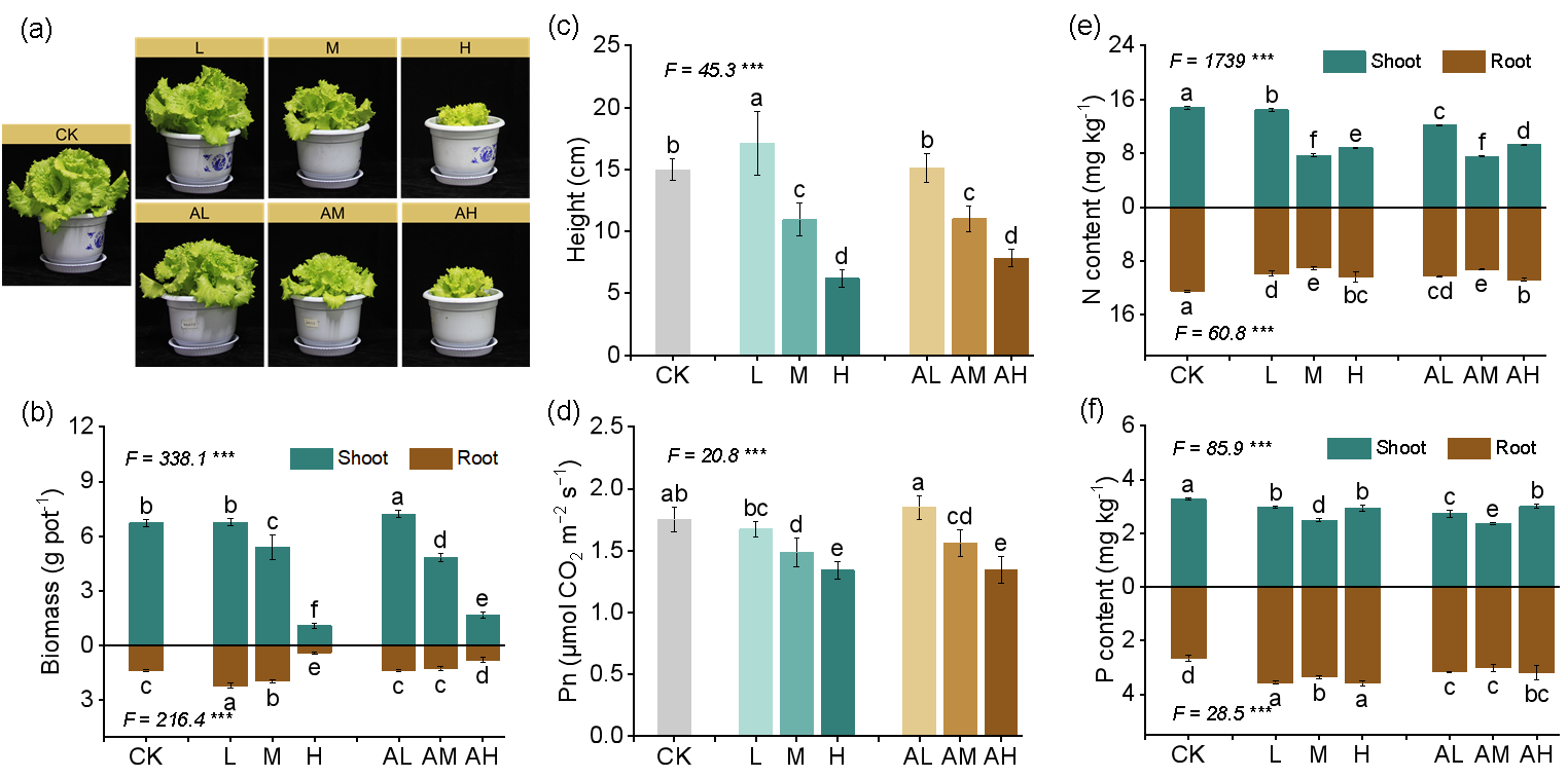 无论是否老化,低浓度PLA MPs处理对生菜生长无显著影响,而在中、高剂量条件下,PLA MPs显著降低了生菜地上部生物量、株高和光合效率(图2)。