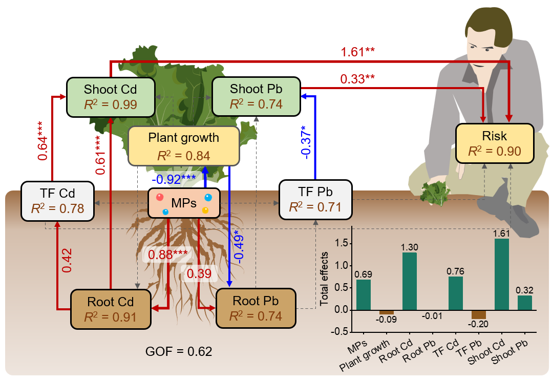 图5 偏最小二乘模型展示了MPs、植物生长、植物Cd/Pb吸收和重金属迁移转化对人体健康风险的影响途径