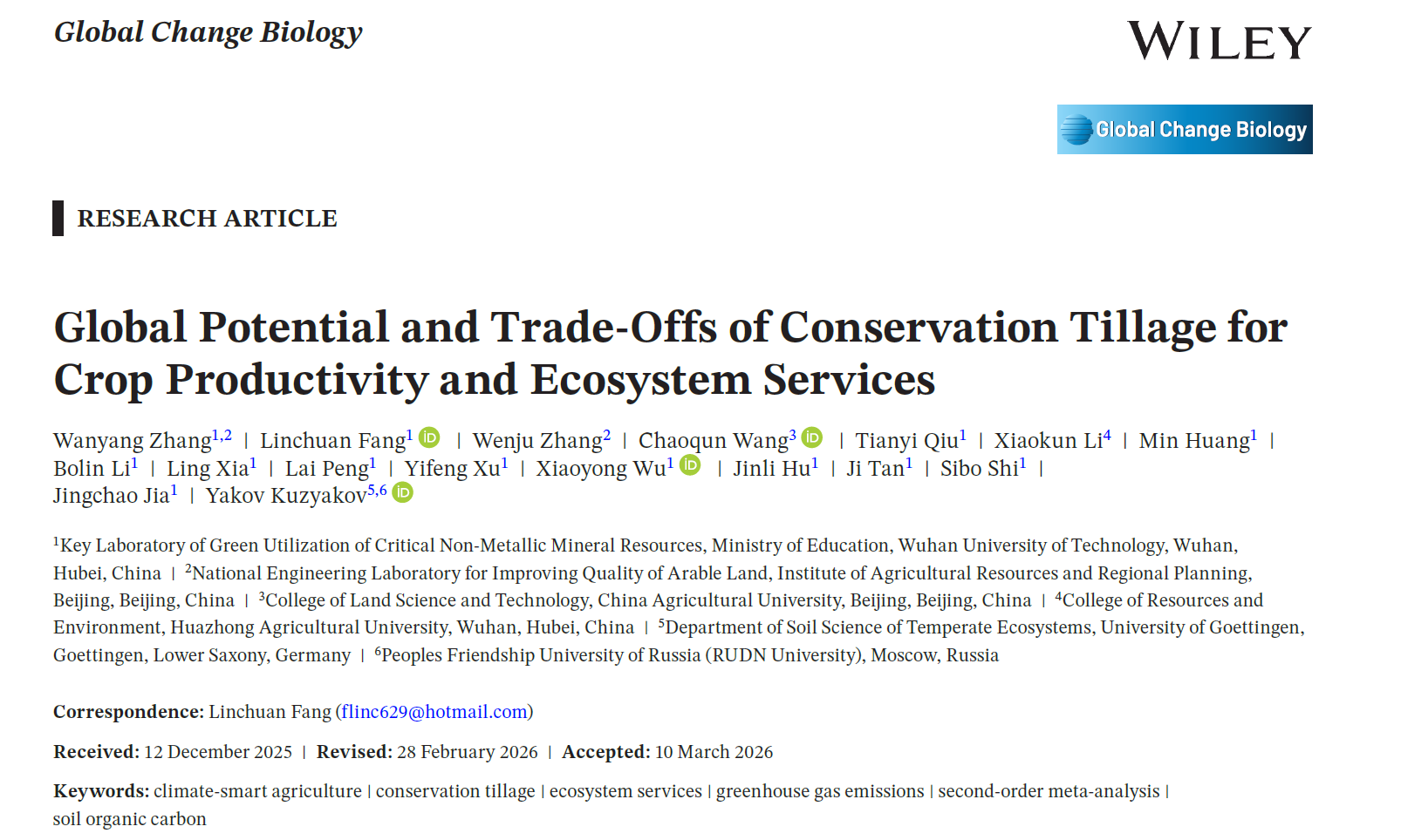 上述研究以“Global potential and trade-offs of conservation tillage for crop productivity and ecosystem services”为题发表于权威期刊Global Change Biology。武汉理工大学资源与环境工程学院博士后张万洋为论文第一作者,方临川教授为通讯作者。中国农业科学院农业资源与农业区划研究所张文菊研究员、中国农业大学王超群教授、华中农业大学李小坤教授、德国哥廷根大学Yakov Kuzyakov教授以及本团队黄敏副教授、邱天逸博士、胡金丽、谭季、石思博和贾竞超博士后等成员参与上述工作。