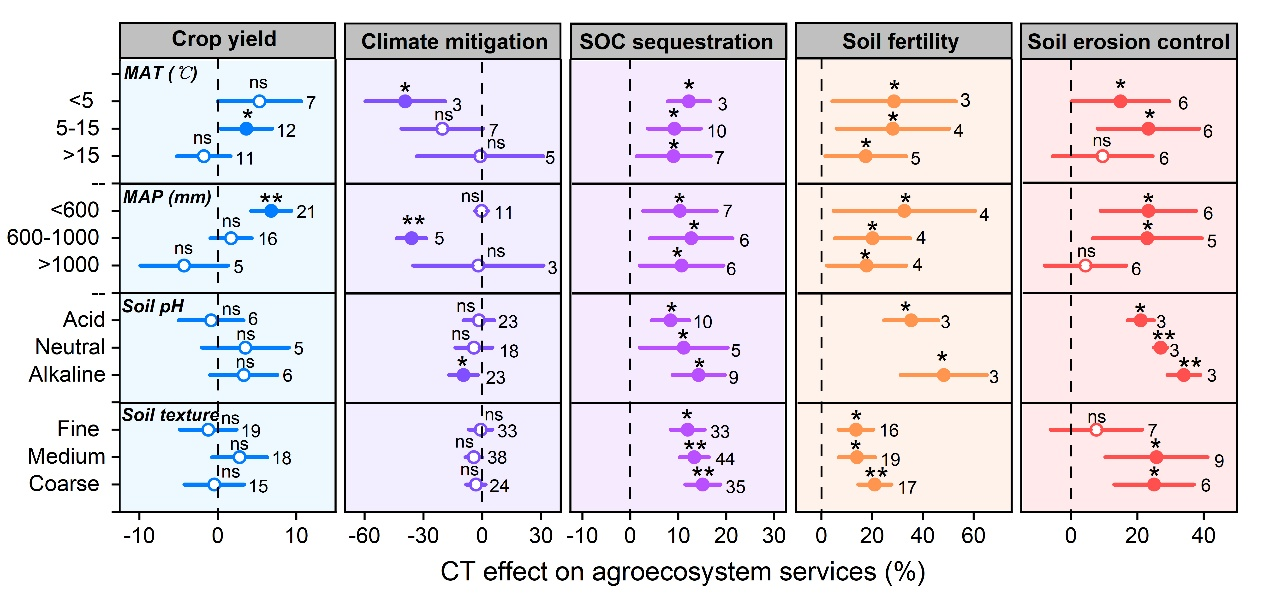 保护性农业(CA)是实现可持续集约化的关键,但其核心措施—保护性耕作(CT)在全球不同环境背景下能否协调作物生产力与生态系统服务之间的权衡关系,仍存在争议。为此,本研究综合了69项已发表的Meta分析研究开展了二阶Meta分析,以提供CT对粮食生产与生态系统服务功能的全球统一评估框架。全球范围内,CT能够显著增强关键的农业生态系统服务,包括温室气体减排、土壤碳固存、土壤肥力提升和侵蚀控制,同时保持作物产量稳定,这为长期以来关于CT综合效益的争议提供了确凿证据。然而,CT也可能导致作物产量与生态系统服务(尤其是作物产量与温室气体减排)之间的部分权衡,且这些权衡关系高度依赖于气候、土壤及管理措施的影响。例如,在半干/干旱区域的碱性土壤中,结合秸秆还田和多样化轮作的保护性耕作能够有效地减少这种权衡取舍,并增强协同效应。总之,我们的综合研究表明,因地制宜地优化保护性耕作实践,对于协调农业生产力与生态系统服务、进而推动全球气候适应型农业系统的发展至关重要。